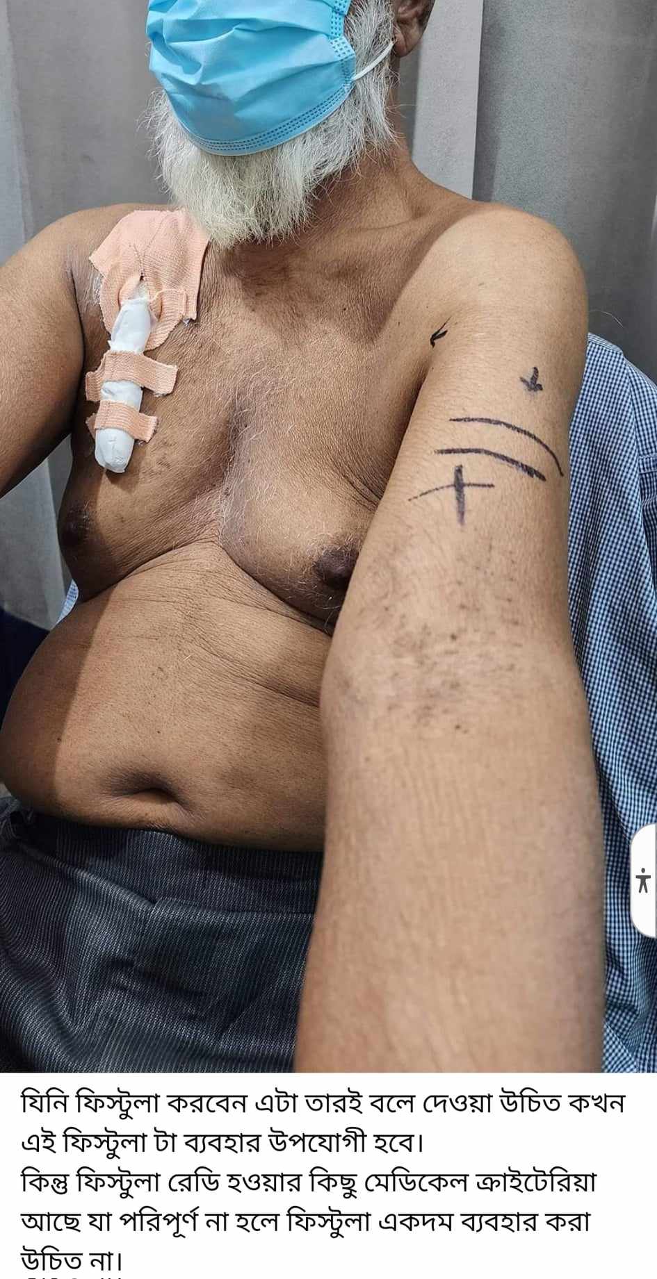 💥আর একটা খুবই গুরুত্বপূর্ণ ব্যাপার হলো যখনই কিডনি ফেইলুর ধরা পড়বে তখনই রোগীদের এটা নিজ থেকেই এনসিউর করতে হবে যে, যে হাতে সে কম কাজ করে অর্থাৎ নন ডমিনেন্ট হ্যান্ড এ কোন ধরনের ইনজেকশন স্যালাইন দেওয়া যাবে না অর্থাৎ ওই হাত ফিস্টুলার জন্য প্রিজার্ভ করতে হবে যাতে ওই হাতের রক্তনালী গুলো ফ্রেশ থাকে।