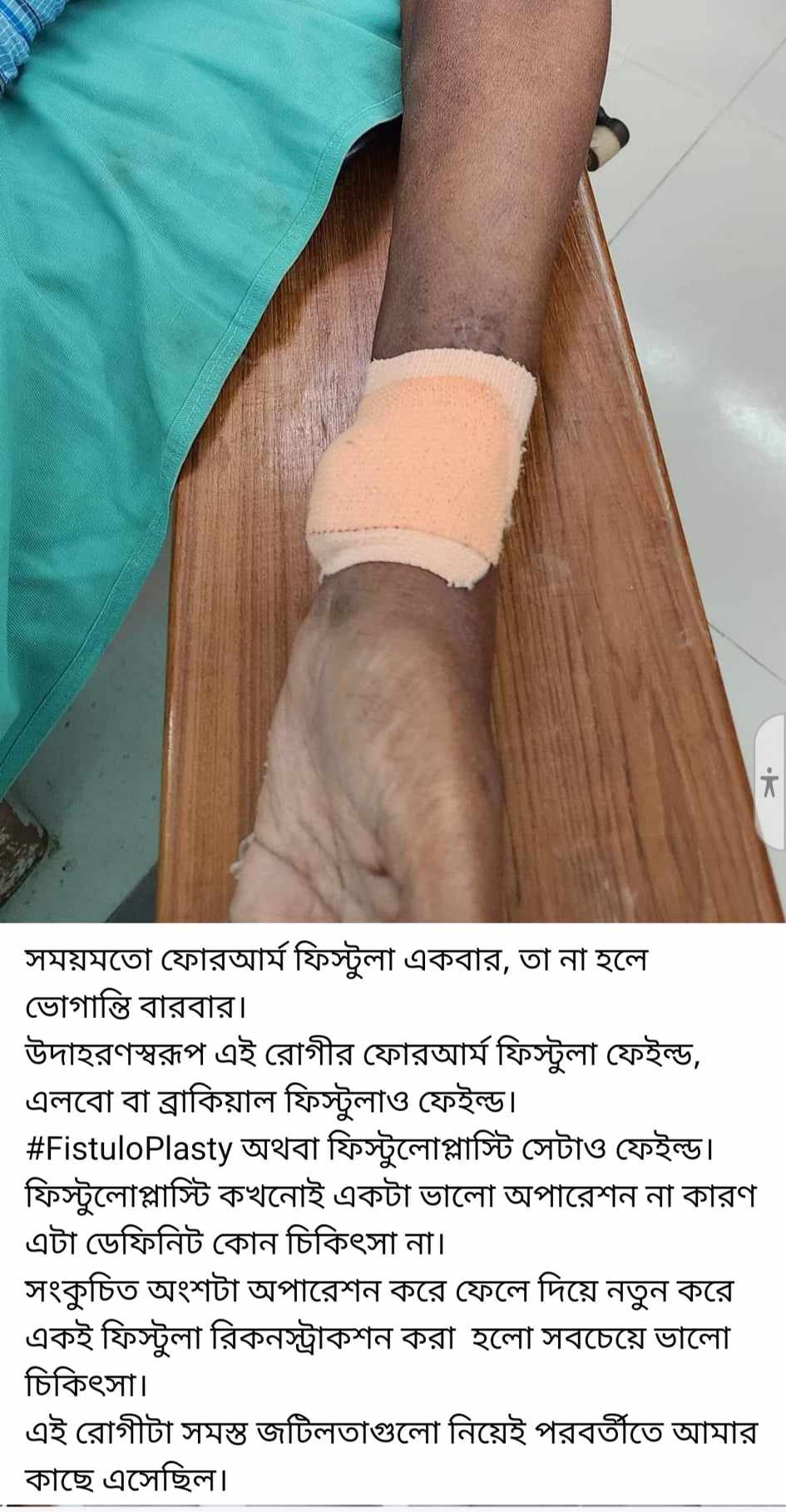 কিন্তু বড়ই দুর্ভাগ্যজনক যে আমাদের দেশের অধিকাংশই কিডনি রোগীরা সময় মত ফিস্টুলা করে রাখেন না, সম্মানিত নেফ্রোলজিস্টগন সাজেস্ট করার পরও।